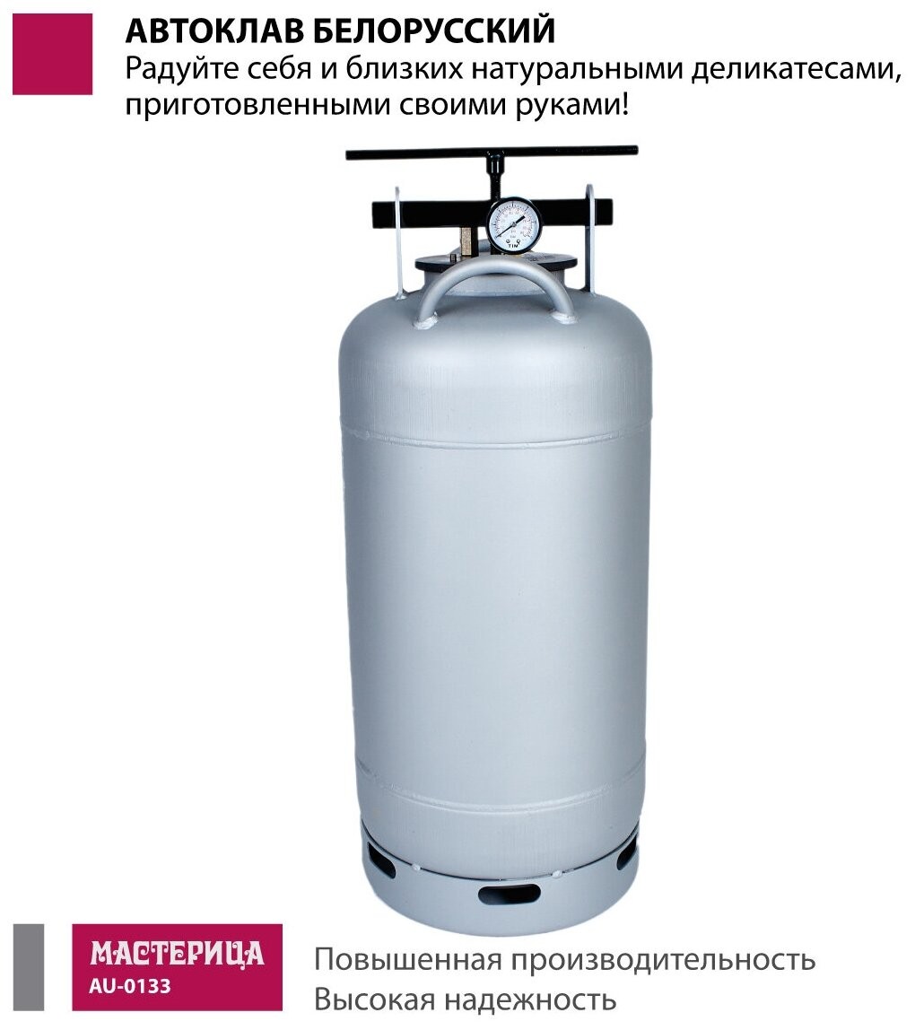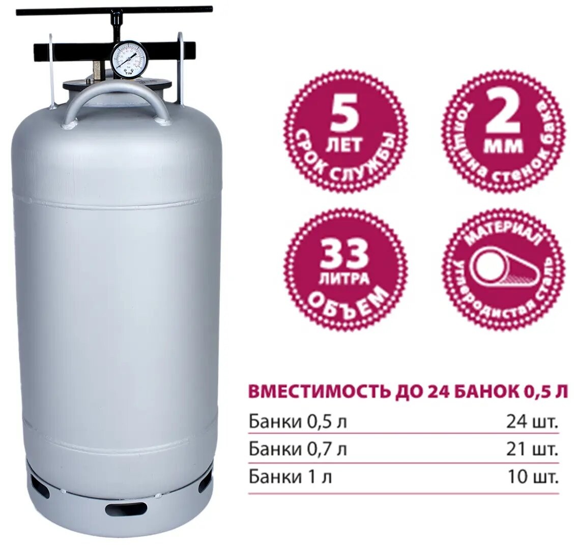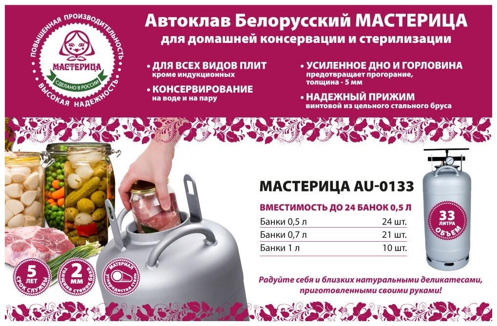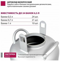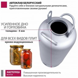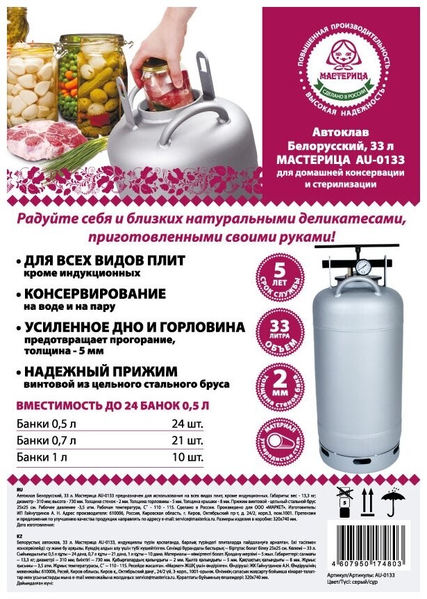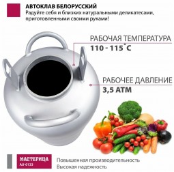 | Подробная комплектация | бак автоклава; прокладка на бак - 2 шт., крышка автоклава (клапан, ниппель, манометр); прижим винтовой; гарантийный талон; паспорт; книга рецептов по консервированию |