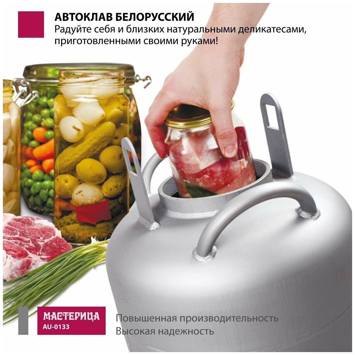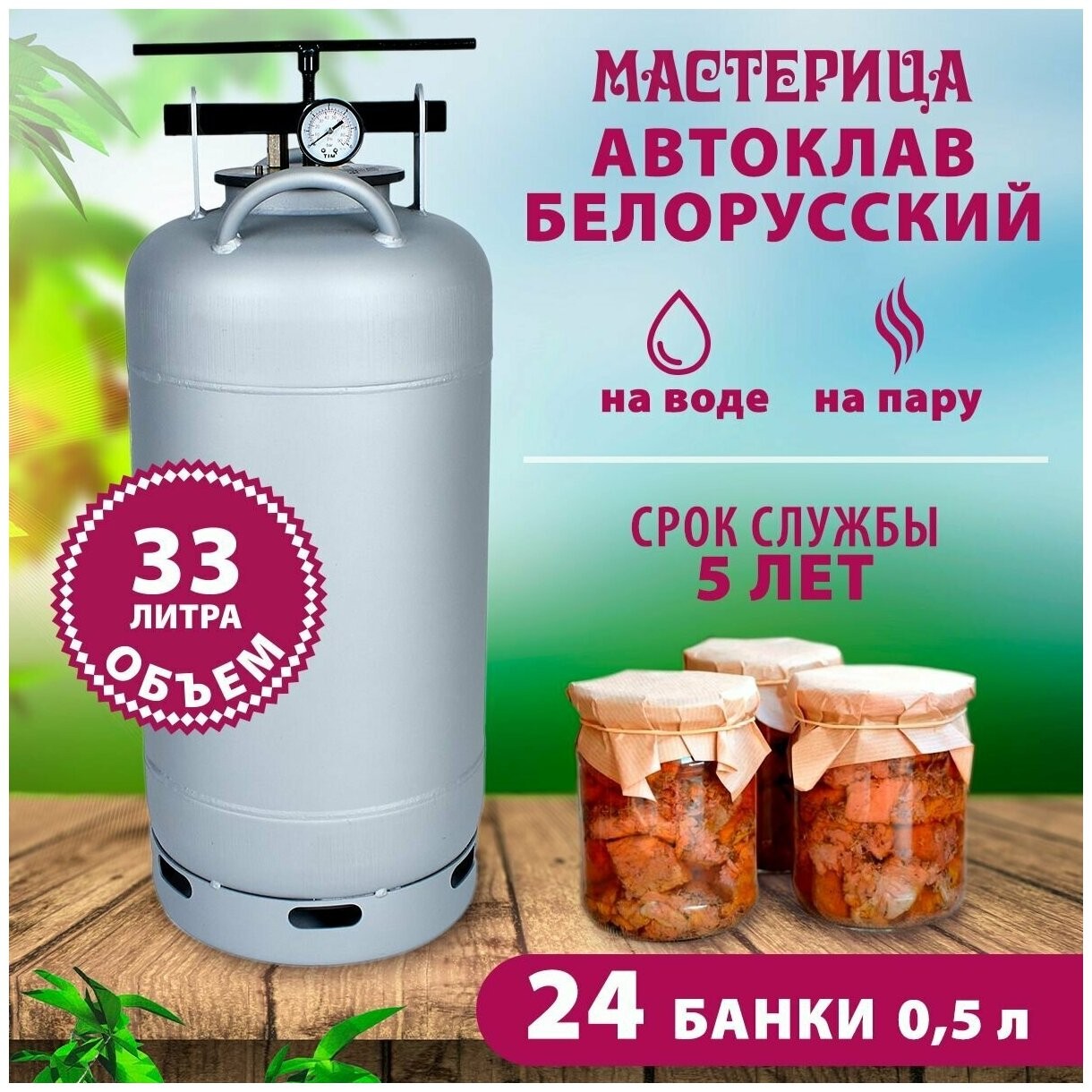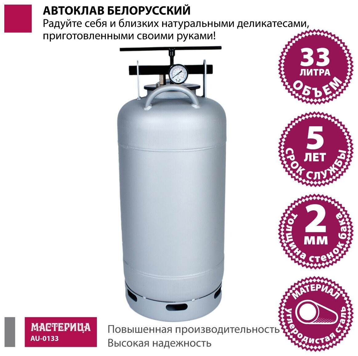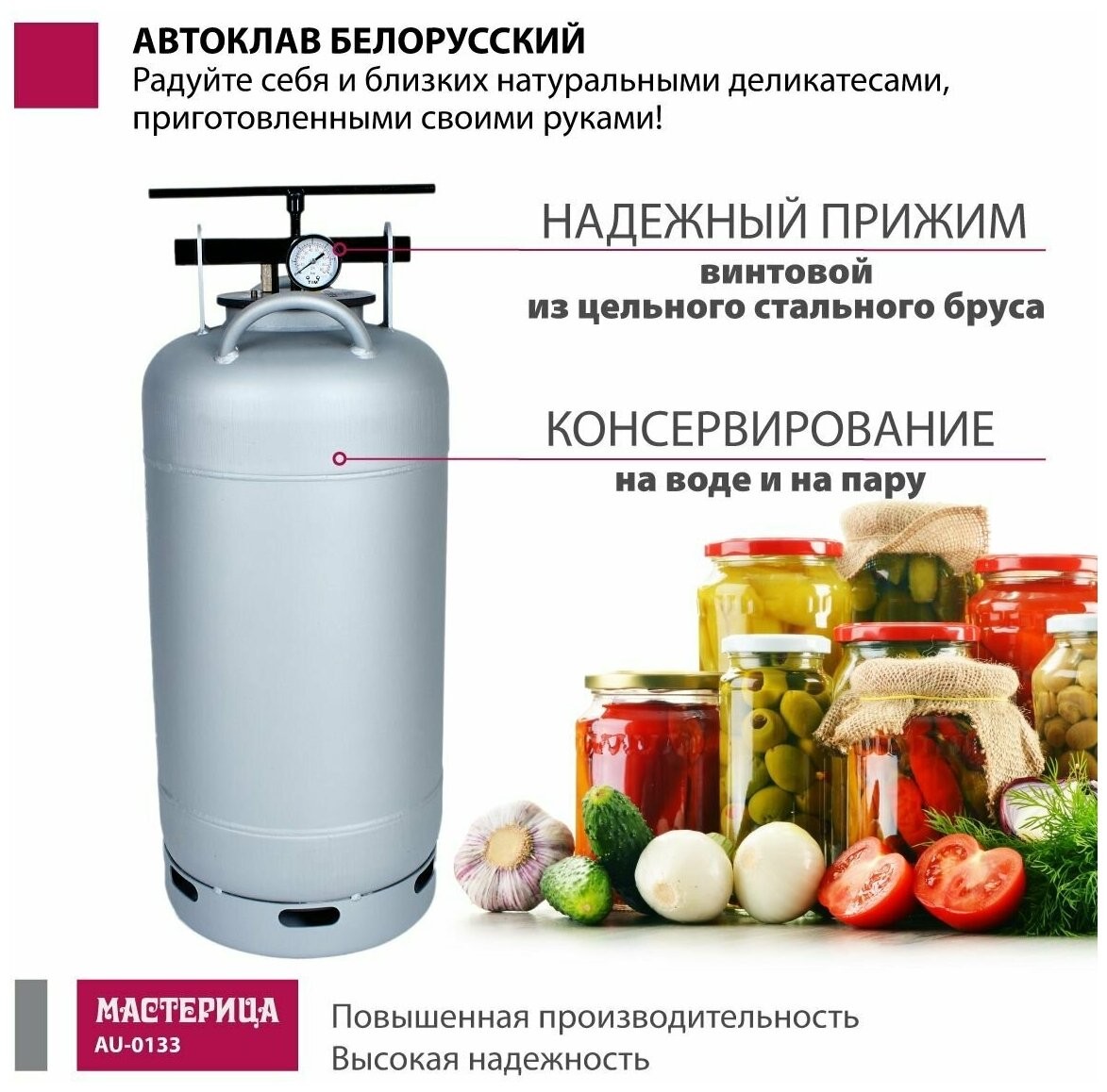 | Подробная комплектация | бак автоклава; прокладка на бак - 2 шт., крышка автоклава (клапан, ниппель, манометр); прижим винтовой; гарантийный талон; паспорт; книга рецептов по консервированию |