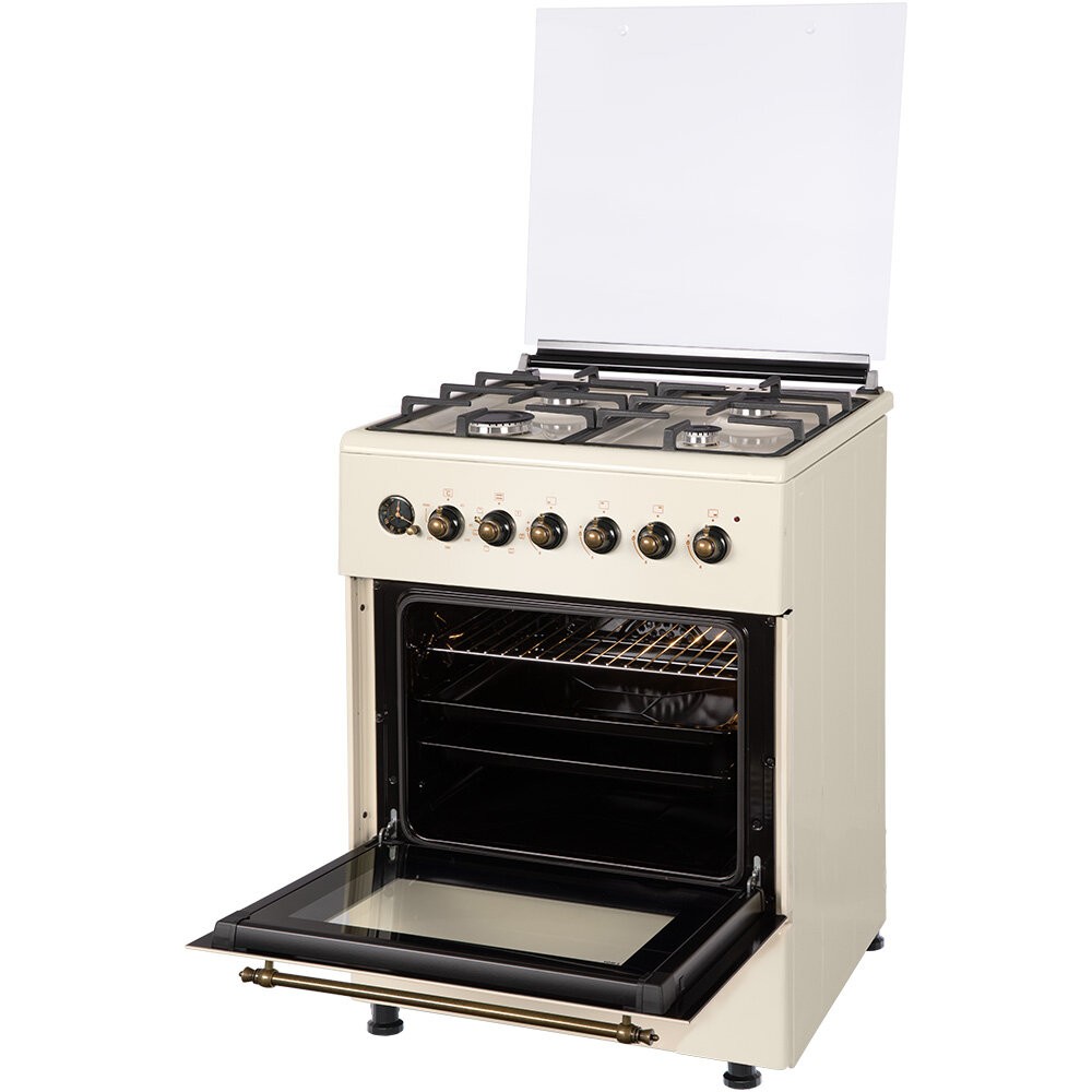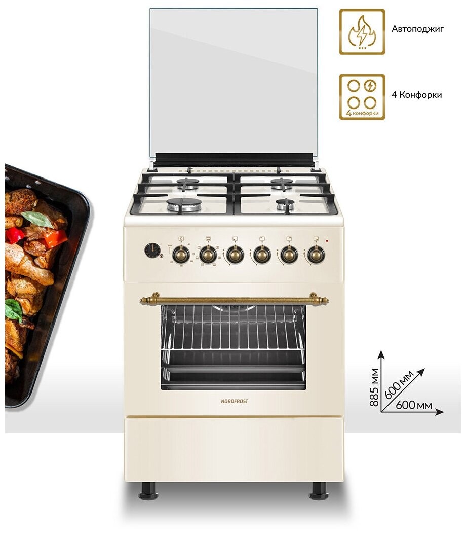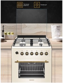 | Особенности конструкции | подсветка духовки, часы, чугунные решетки, ящик для посуды |